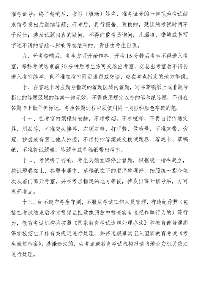 3、考生应自觉遵守国家教育考试相关规定,在考试过程中严格遵守考试纪律和考场规则,服从考试工作人员管理,主动接受监考员按规定进行的身份验证和对随身物品等进行的必要检查。遵守《考生守则》(附件),对发现的考生违纪、作弊等行为,将按照《国家教育考试违规处理办法》(教育部33号令)及有关规定进行处理,并将记入国家教育考试诚信档案。情节严重,触犯刑律的,将按《刑法》修正案(九)第二十五条追究刑责。