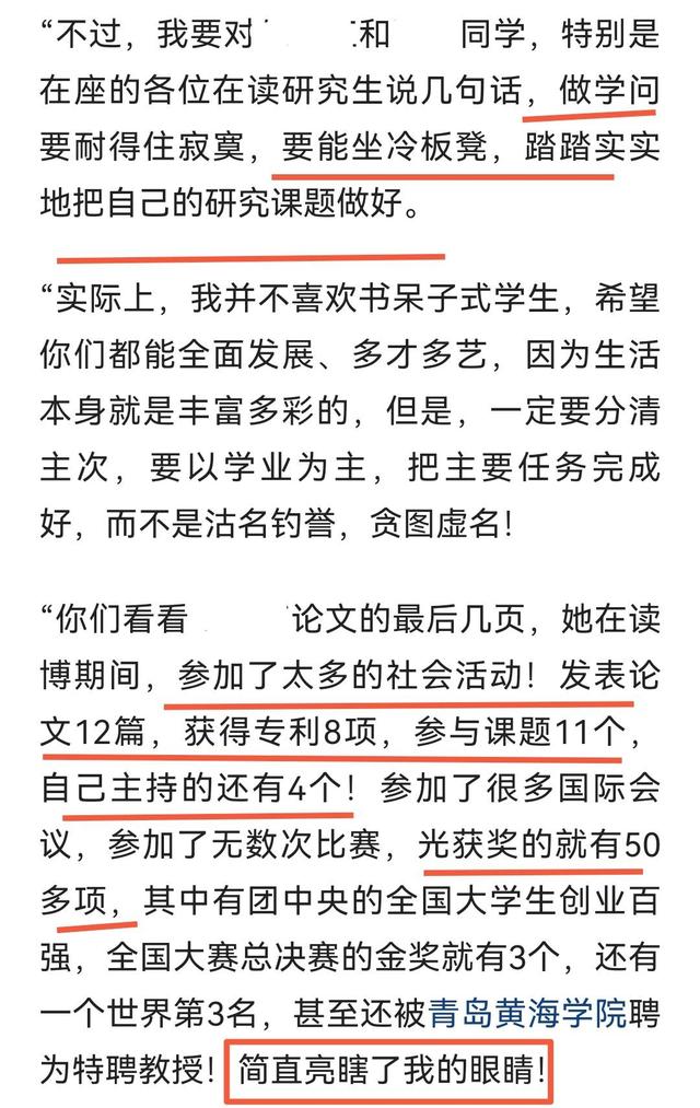教授还说:“你们看看xxx(该博士生姓名)同学论文的最后几页,她在读博期间,参加了太多社会活动!发表论文12篇,获得专利8项,参与课题11个,自己主持的还有4个,还参加了很多国际会议,参加了无数比赛,光获奖的就有50多个……简直亮瞎我的眼睛!”。