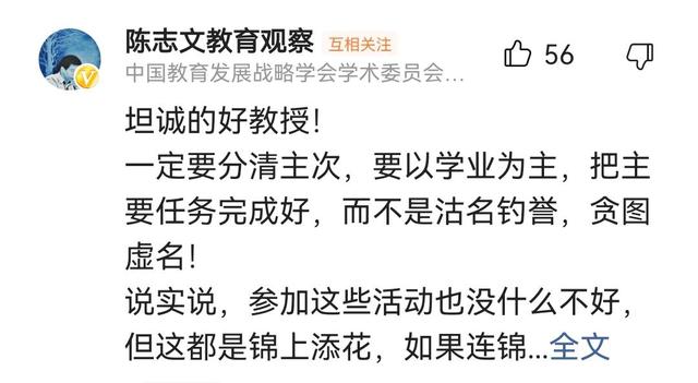中国教育发展战略学会学术委员会委员陈志文老师评论说,“坦诚的好教授!一定要分清主次,以学业为主,把主要任务完成好,而不是沽名钓誉,贪图虚名。”。