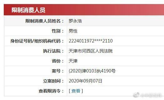 12月8日消息,中国执行信息公开网显示,罗永浩新增一则被限制消费信息。该限制消费令案号为(2020)津0103执4190号,立案日期为2020年9月7日,执行法院是天津市河西区人民法院。同时,天眼查App也显示,近日,北京锤子数码科技有限公司新增一则被限制消费信息,该限制消费令案号为(2020)津0103执4190号,被限制消费人员为罗永浩。因限高坐17个小时车到上海领奖对此锤子科技CEO罗永浩于12月10日晚间作出回应,表示限高的事情已经跟债权方达成和解,让大家担心了,非常抱歉。因为有很多官司在同时滚动