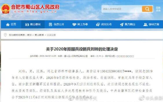 据合肥市蜀山区人民政府网站4月2日消息,蜀山区人民政府征兵办公室2021年3月16日已作出《关于2020年拒服兵役新兵刘帅的处理决定》。刘帅,男,汉族,河北省邯郸市临漳县人,该同志2019年考入安徽农业大学,2020年9月经体格检查、政治考核、役前训练、审批定兵等手续正常入伍,被分配至新疆军区某部服役。2020年9月17日到达部队后,次日该同志就表现出不适应,提出要离开部队。经部队及其家人多次思想教育和引导无效后,中共南疆军区纪律检查委员会于2020年11月6日对刘帅做出拒服兵役除名处理决定。按照相关规定