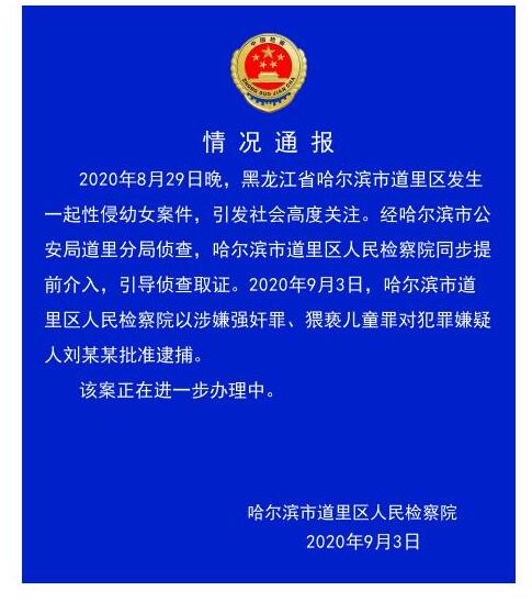 情况通报2020年8月29日晚,黑龙江省哈尔滨市道里区发生一起性侵幼女案件,引发社会高度关注。经哈尔滨市公安局道里分局侦查,哈尔滨市道里区人民检察院同步提前介入,引导侦查取证。2020年9月3日, 哈尔滨