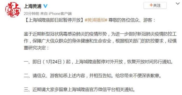 上海城隍庙自1月24日起暂停开放 恢复开放时间另行通知
