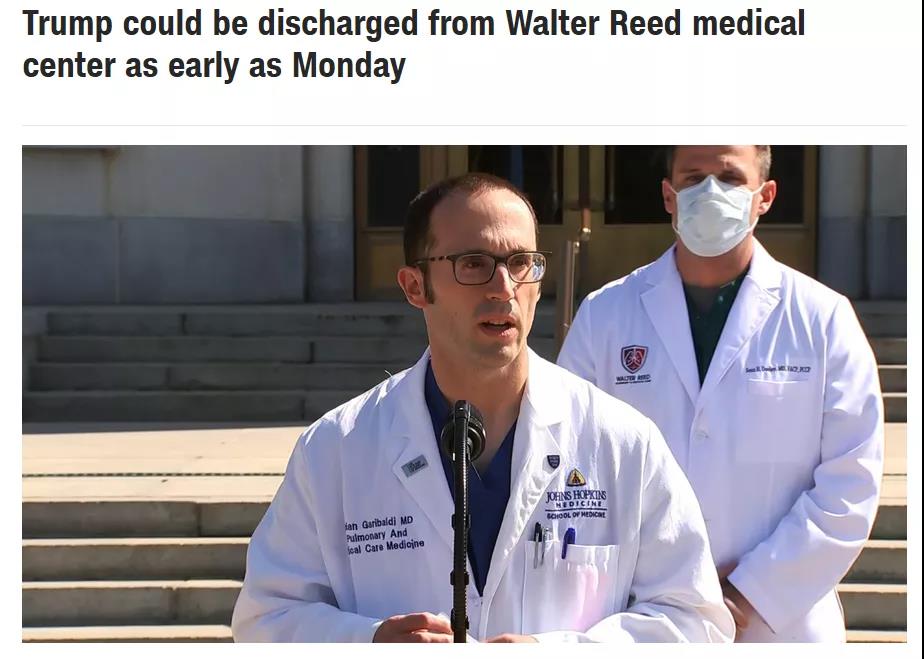 据美国有线电视新闻网(CNN)消息,美国总统特朗普当地时间4日下午,乘坐专车短暂离开沃尔特·里德医疗中心。出行过程中,他在车内向医院外的支持者挥手致意。特朗普乘专车向医院外的支持者挥手致意。特朗