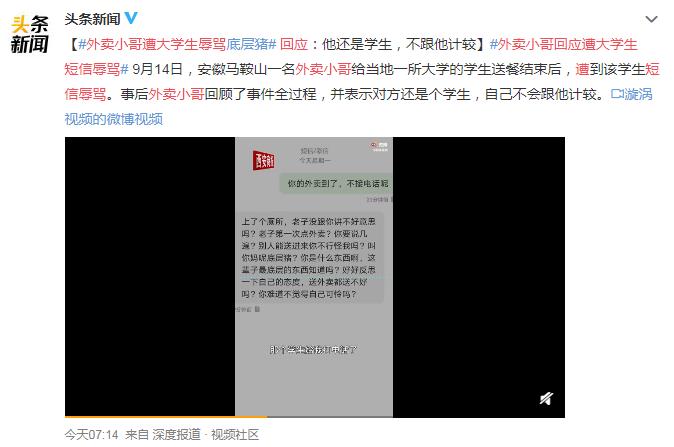 #外卖小哥回应遭大学生短信辱骂#9月14日,安徽马鞍山一名外卖小哥给当地一所大学的学生送餐结束后,遭到该学生短信辱骂。事后外卖小哥回顾了事件全过程,并表示对方还是个学生,自己不会跟他计较。网友: