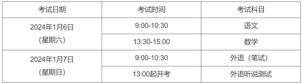 温馨提示:双一流大学2023年录取分数线汇总,点击此处下载,来看看你能上哪些大学!2024年1月上海市普通高中学业水平合格性考试(语文、数学、外语科目)将于1月6日至7日举行,考试安排如下: