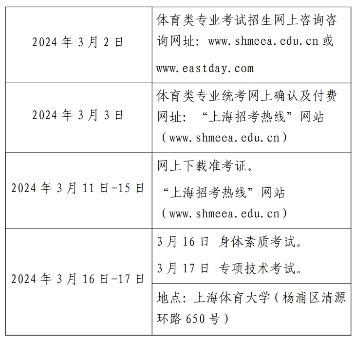 2024年上海市普通高校体育类专业考试招生工作日程 —掌上高考—中国教育在线