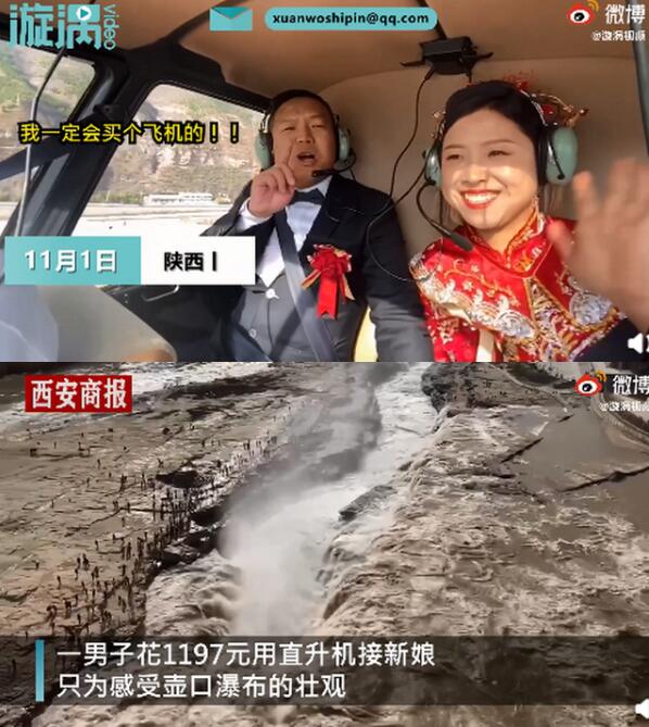 11月1日,陕西延安的赵先生结婚花费1197元用直升机接新娘,只为感受壶口瀑布的壮观。赵先生介绍,因为从小在黄河边长大,对黄河有特别的热爱,所以在自己结婚的时候就想到了唢呐和黄河。据悉,婚礼现场的唢呐演奏者,曾在30年前为他父母的婚礼演奏过乐曲。网友评论网友:非常有意思延伸阅读:结婚日大雪封路 两位新郎坐高铁接亲“来来,大家吃喜糖!”2018年1月5日,在武汉开往北京西的G510次列车上,两对新人和列车长一起挨个车厢发起了喜糖,引起了众人的围观。原来,家住明港的李先生定于1月5日前