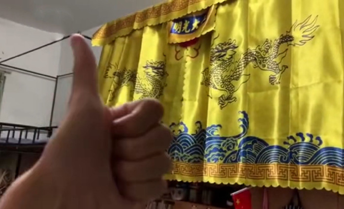 10月24日,浙江金华职业技术学院一男生宿舍中,一名同学将大学宿舍常见的床上遮光帘换成了清宫金銮殿风格的床垫,正中还挂有“正大光明”字样,迅速在网络走红。此视频一出,引发了网友热议:有女生表示非常有趣,想前去打卡;也有网友表示这就去下单同款;当然,也有人不能认同,表示这些都是有讲究的,晚上睡觉会害怕。同时,网上也有人晒出自己“御书房”的床帘隔空呼应。对此你怎么看呢?原标题:一男生宿舍挂“正大光明”床帘走红 网友:会怕吧