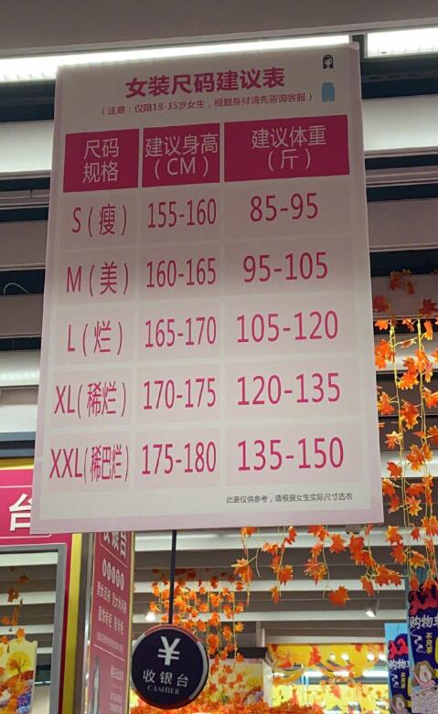 【大润发就女装尺码建议表致歉】近日网上流传大润发商场女装尺码建议表上标注L对应“烂”,XL对应“稀烂”,XXL对应“稀巴烂”。@大润发 官方微博11月12日上午发表声明称,确有此事,将加强内部管理,确保此类事件不再发生。 原标题:大润发就女装尺码建议表致歉