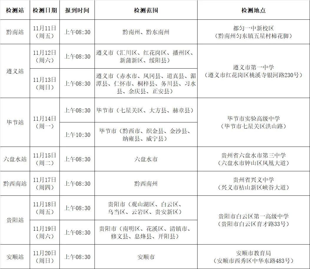 根据2023年度空军招飞工作安排,2022年11月11日至11月20日,空军招飞局成都选拔中心将派初选检测组赴贵州省各地市组织初选检测,铜仁市初选检测工作因受疫情影响另行通知,请及时关注学校或空军西南招飞微信公众号通知。具体安排如下:参检须知:1.此次初选检测仅限高三男生参加。2.报名学生由学校统一组织带队,往返途中做好安全防护;符合报名条件、前期未报名的学生可直接到检测现场报名参检;为减少人员聚集,请各位参检学生不在现场逗留,如被淘汰立即离开检测站。3.参检学生携带本人身份证(或户口簿)、《空军招收飞行
