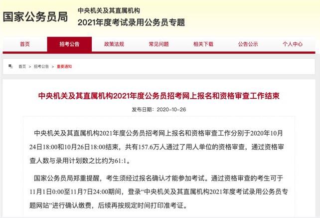 【国考报名人数达157.6万】据国家公务员局网站发布的消息,中央机关及其直属机构 2021 年度公务员招考网上报名和资格审查工作已经结束,共有157. 6 万人通过了用人单位的资格审查,通过资格审查人数与录用计划数之比约为61:1。国家公务员局郑重提醒,考生须经过报名确认才能参加考试。通过资格审查的考生可于 11 月 1 日0: 00 至 11 月 7 日24: 00 期间,登录“中央机关及其直属机构 2021 年度考试录用公务员专题网站”进行确认缴费,后续再按规定时间打印准考证。