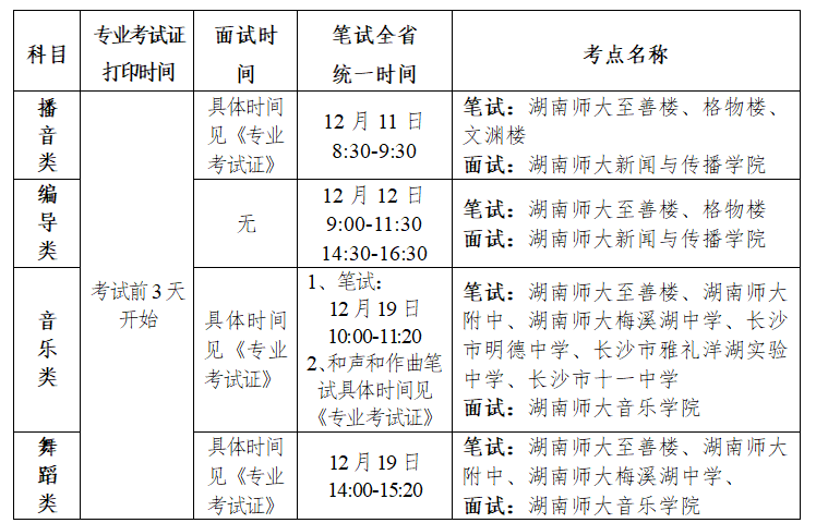 温馨提示:双一流大学2023年录取分数线汇总,点击此处下载,来看看你能上哪些大学!考试时间和考点安排科类面试时间笔试全省统一时间考点名称音乐类具体时间见《专业考试证》12月17日上午10:00-11:30笔试:湖南师大至善楼、湖南师大附中、长沙市周南中学、长沙市东雅中学、长沙市弘益高级中学面试:湖南师大音乐学院舞蹈类无笔试科目面试:湖南师大音乐学院播音与主持类无笔试科目面试:湖南师大至善楼考生面试时间、面试所在考场以及笔试所在考点考场由电脑随机编排,具体详见本人《专业考试证》。考前3天起,考生可登录“报名