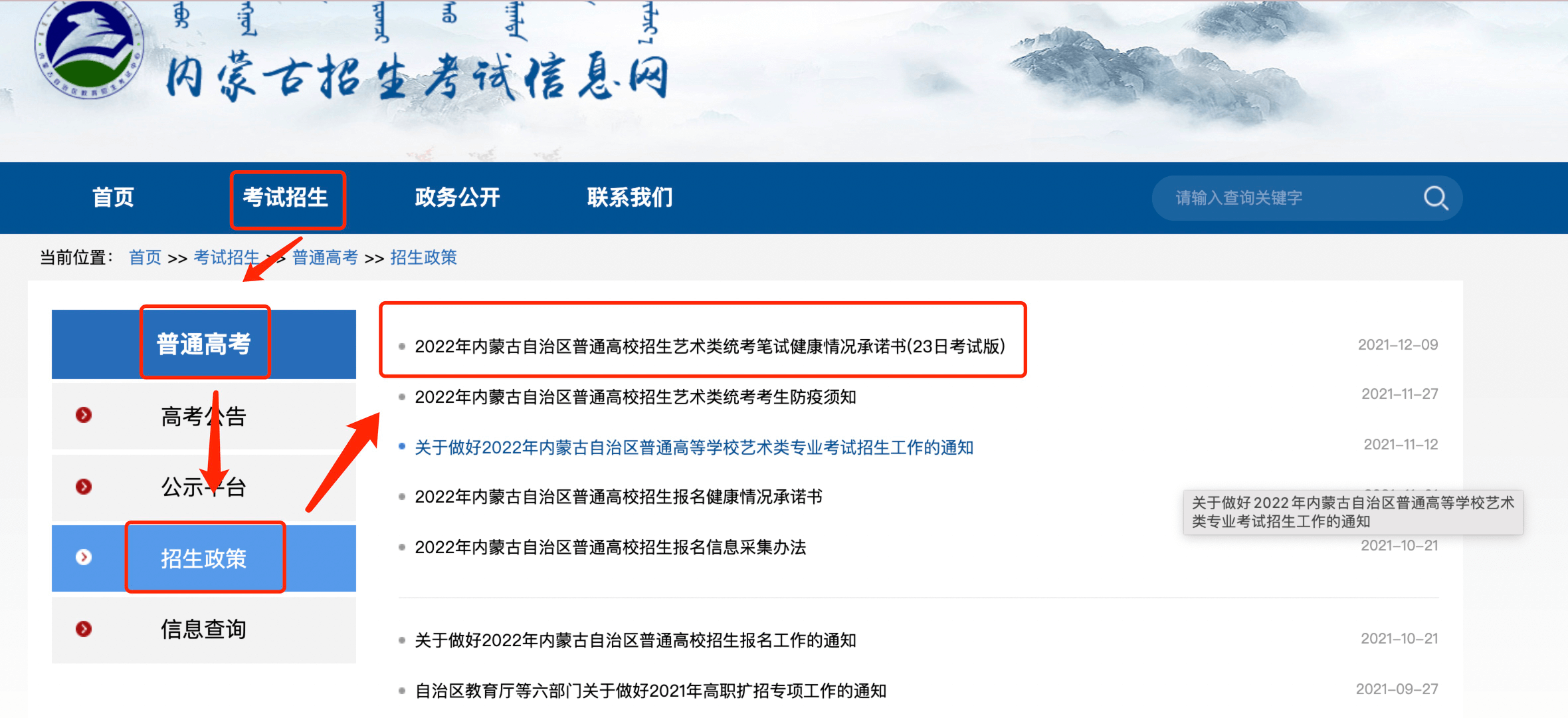 因2022年普通高等学校招生艺术类(美术、音乐和编导)专业统考(笔试)考试时间调整为2021年12月23日,请各位艺术类专业统考考生登录内蒙古招生考试信息网(网址:https://www.nm.zsks.cn)重新下载打印《健康情况承诺书》,并认真做好每日体温测量、记录和健康状况监测,如实填写在《健康情况承诺书》上,第一场考试人脸识别身份验证时上交考点核验。下载流程:登录内蒙古招生考试信息网,点击“考试招生”→“普通高考”→“招生政策”,在页面右边点击《2022年内蒙古自治区普通高校招生艺术类统考笔试健康