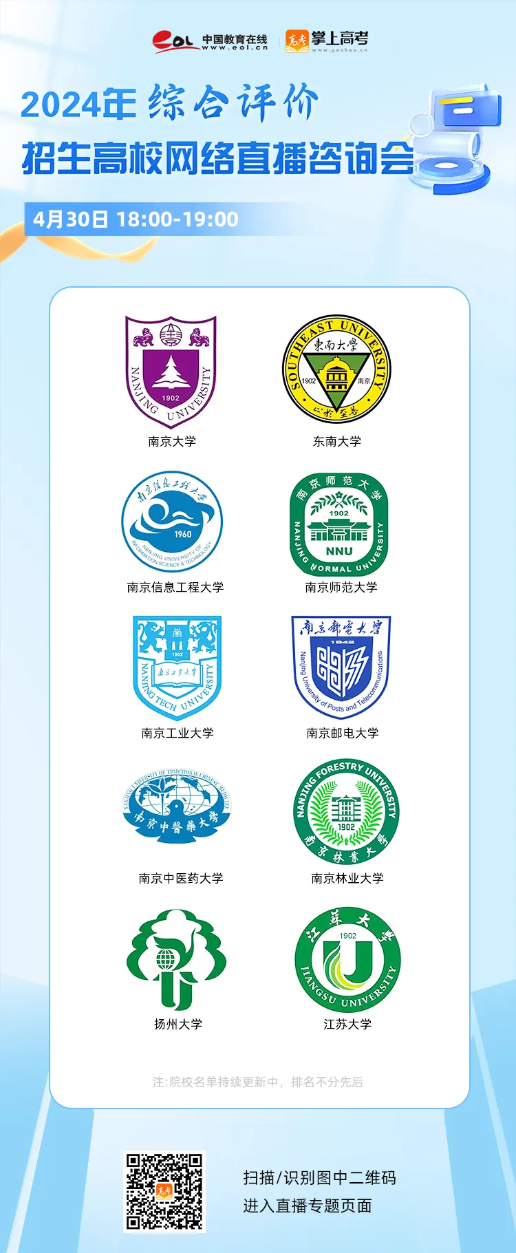 温馨提示:高三二模成绩已出,点击此处,测测你的分数,能上哪些大学!目前,2024年综合评价招生已陆续开启。综合评价招生作为新高考改革的关键举措之一,在满足高校多元化人才培养的同时,也备受考生的关注,吸引了更多考生报考。与普通高考相比,综合评价招生具有怎样的特点和优势?要不要报考综合评价招生?哪类考生更适合报考?为帮助考生和家长精准把握各校的综合评价招生政策,掌握一手信息,中国教育在线联合各高校于4月30日18:00举办“2024年综合评价招生高校网络直播咨询会”公益活动。届时,近20所面向江苏、山东招生的