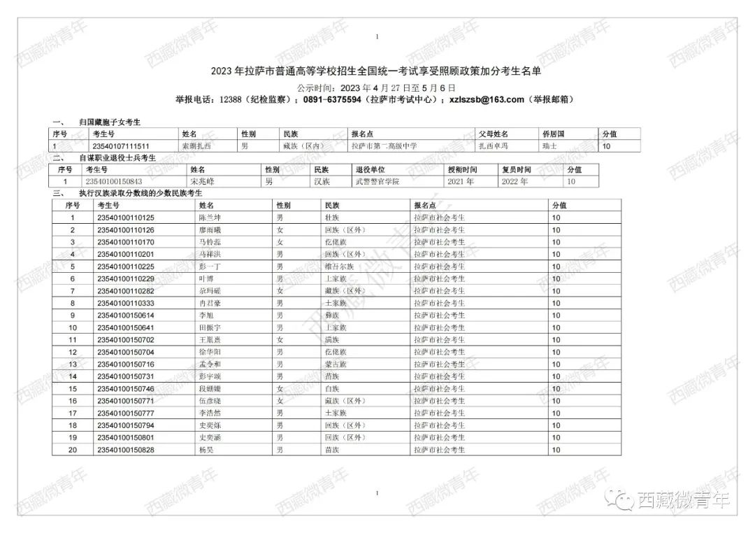 温馨提示:2023年高考进入倒计时,点击下载掌上高考app,获取各省历年真题、真题答案、详细解析。查分数、查专业、一键填报志愿。助力高考,金榜题名!名单公示根据《关于做好西藏自治区2023年普通高校招生工作的通知》(藏教厅〔2023〕57号)文件要求,现将我市符合西藏自治区2023年普通高考照顾政策的考生名单进行公示,公示期间,敬请监督。公示期2023年4月26日至5月6日举报电话全国纪检监察机关统一举报电话:12388市教育局考试中心:0891-6375594举报邮箱xzlszsb@163.com拉萨市