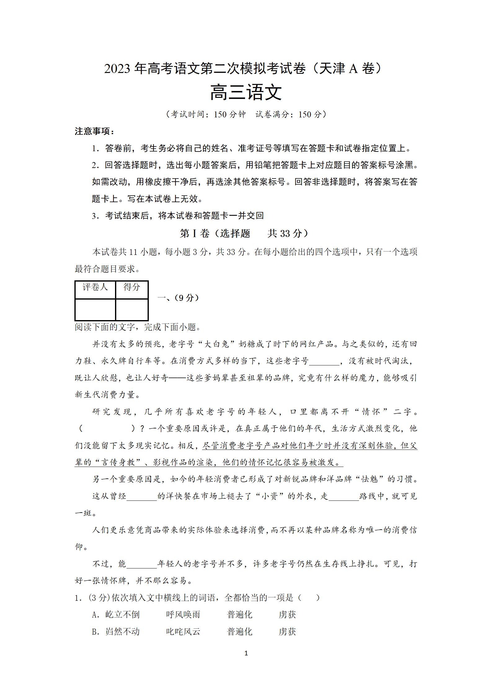 温馨提示:2023年高考进入倒计时,复习备考,点击下载「2009-2022历年真题」,助力高考,金榜题名!2023年高考天津第二次模拟考试已考完,掌上高考为考生整理2023年高考天津语文第二次模拟试题答案解析,供大家查看:语文(天津A卷)(全解全析)_01