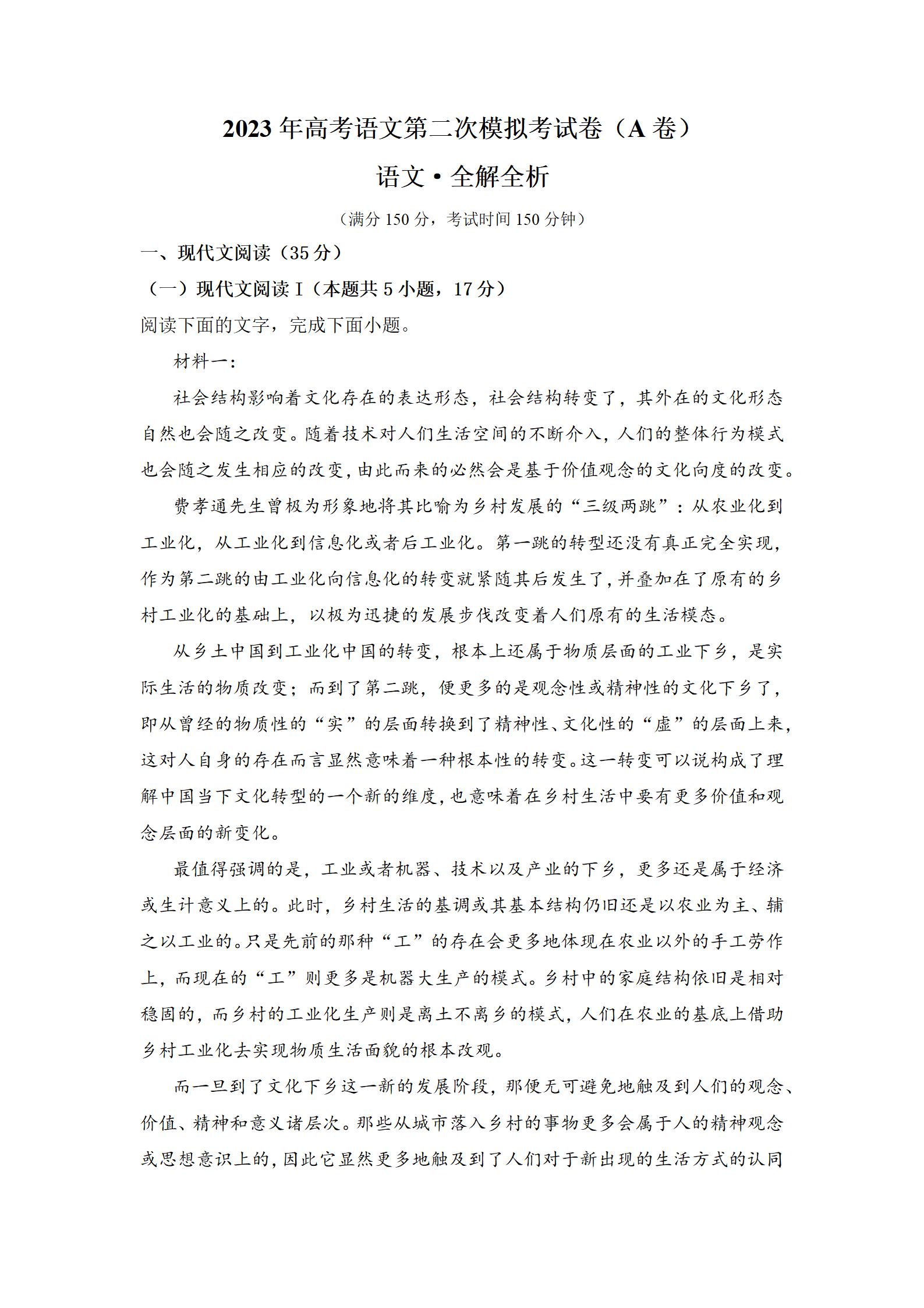 温馨提示:2023年高考进入倒计时,复习备考,点击下载「2009-2022历年真题」,助力高考,金榜题名!2023年高考上海第二次模拟考试已考完,掌上高考为考生整理2023年高考上海语文第二次模拟试题答案解析,供大家查看:语文(上海A卷)(全解全析)_01