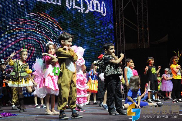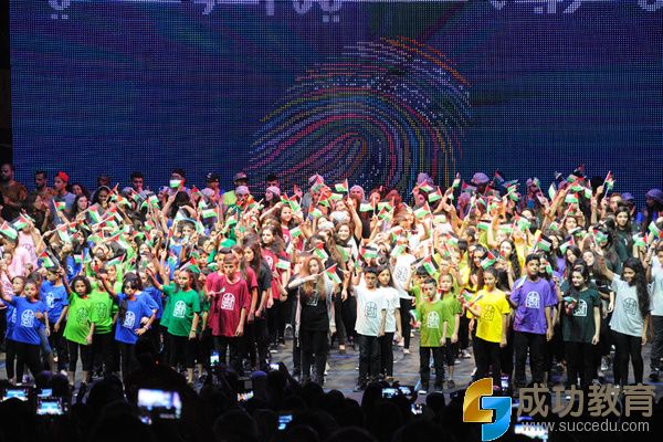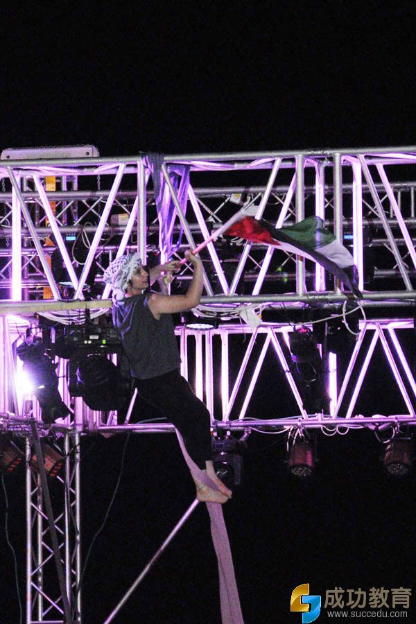 在巴勒斯坦文化中心的露天演出场,巴勒斯坦青年男女们献上精彩的现代舞开场表演。一个个穿着不同颜色上衣的孩子们挥动着手中的国旗一排排站在舞台上,一位舞蹈演员随着彩带爬到了舞台最高处插上了巴勒斯坦国旗。