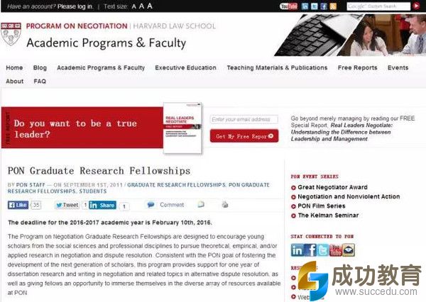 哈佛大学法学院2016-2017年PON研究生奖学金,国际生可以申请!面向谈判和解决纠纷领域、持有不同理论和研究传统的博士研究生。奖金高达2万美金!截止日期2016年2月10日。