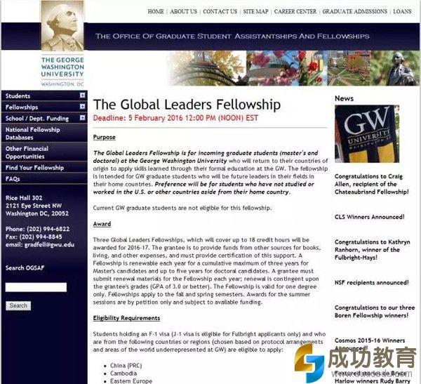 申请详情:http://www.gwu.edu/~fellows/fellowships/global_leaders.html