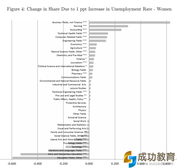 研究进一步表明,对于女性来讲,失业率增长的情况下转向商业有关专业(金融除外)的女性最多,增长点超过0.6%。其次是护理专业(约0.3%)、会计、技术健康领域和计算机相关领域。女性最有可能放弃教育(超过1%)、文学、语言、社会学、心理学、人文科学和历史专业,这些专业在过去大多以女性为主。