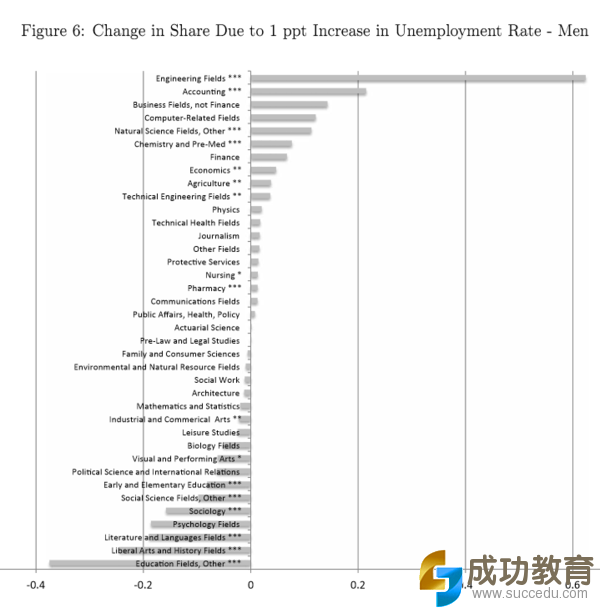 研究发现,失业率每增加1%,选择工程专业的男性上升0.6%。其他上升的专业包括会计(失业率每增加1%,就上升0.2%)、商业(金融除外)、计算机科学和自然科学(均上升0.1%)。经济下行情况下,选择教育、人文科学、历史、语言、心理学和社会学专业的男性数量会减少。
