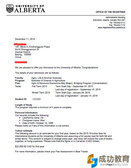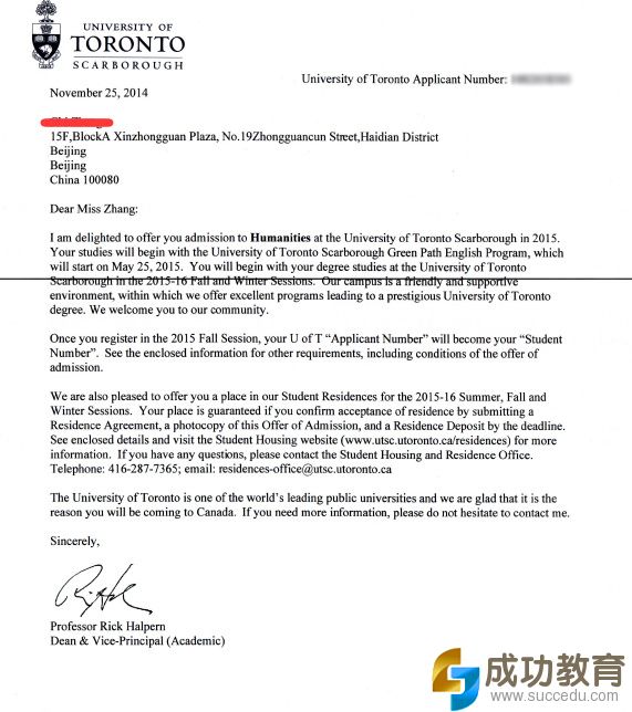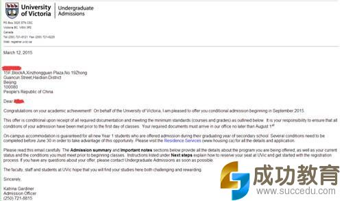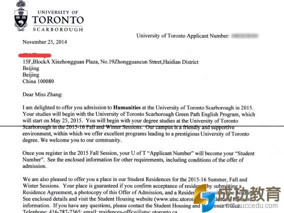 规划老师并没有降低学生的申请期望。而是和学生及家长一起来挖掘一切可以帮助学生申请名校的素材。并积极和学生希望申请的加拿大名校沟通及联系。经过详细了解后,发现学生其实非常内秀的,不仅获得过市三好学生,还组织过学生社团,参加过英语竞赛并获奖。由于学生很早就确定了出国的想法,所以从一开始就在英语上下了很大功夫,所以雅思成绩已经达到了6.5,单科不低于6。在选校上,也推荐学生考虑可以不提供高考成绩的多伦多大学世嘉堡校区,阿尔伯塔大学等。在反复认真准备材料之后,功夫不负有心人。在2015年圣诞节前夕。陆续收到了多伦多大学世嘉堡校区(Toronto University),阿尔伯塔大学(Alberta University)的录取。并且在今年三月份收到了英属哥伦比亚大学和维多利亚大学的录取。学生最终确定入读多伦多大学,实现了自己的愿望。