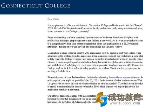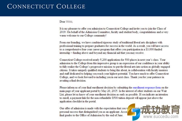 录取过程是曲折的,最终,在被Top50的文理学院放到Waitlist中2周之后,在新航道团队和学生共同努力以及与学校反复套磁下,最终获得Top50文理学院Connecticut College的录取。