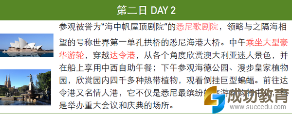 行程介绍:感受历史悠久享誉世界的澳大利亚高等学府,体验悉尼大学知名教授亲自授课,探访澳洲知名企业,收获年轻企业家创业经验,玩转大大小小独特动物园。本条线路将围绕着悉尼,墨尔本,堪培拉三个城市展开,分别从深体验,访名校,重分享,赏美景,4部分内容入手安排,共计12日,带您感受狂野澳洲迷人魅力!