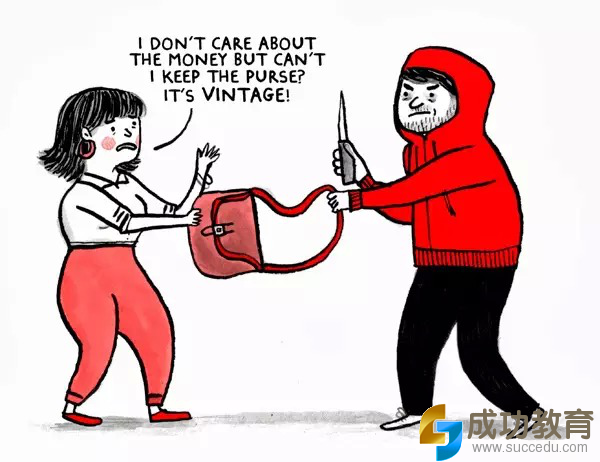 (我20岁那年被两个穿帽衫的人抢劫,要我交出钱包。我不知哪来的胆子,竟然跟他们商量说皮包给他能不能把钱包留下,因为里面有我老师送的Nordstrom礼品卡。他们竟然答应了!)