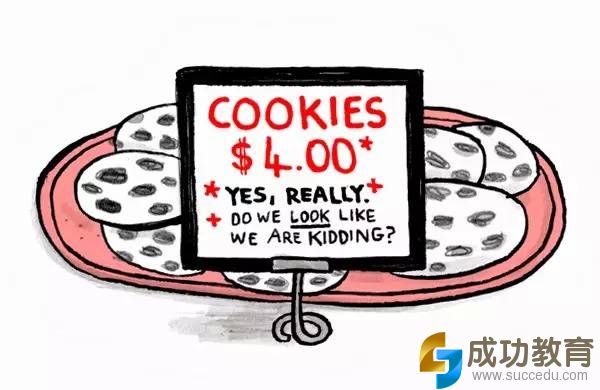 3、东西都神经病似的贵(psychotically)。比如,巧克力曲奇4美元,去咖啡店点一杯柠檬水,10美元!10美元!