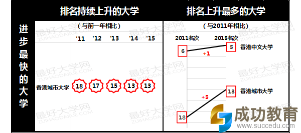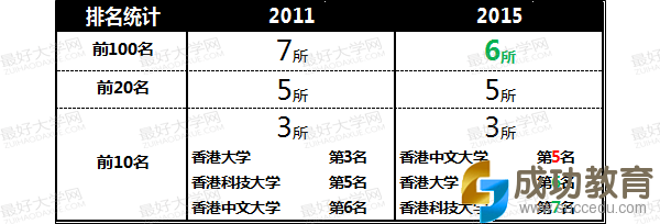 2015年进入百强的6所香港高校分别是:香港中文大学、香港大学、香港科技大学、香港城市大学、香港理工大学和香港浸会大学。其中,香港城市大学自2011年起的名次或在上升或保持不变,其他学校的名次则在五年内有一定浮动。