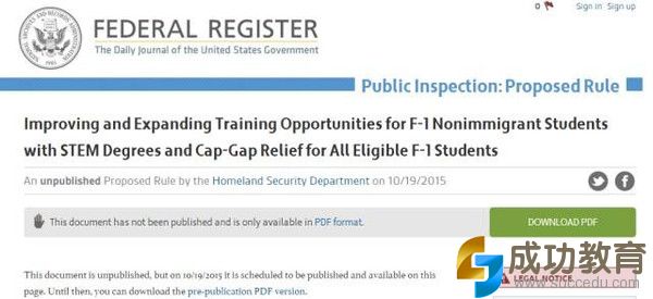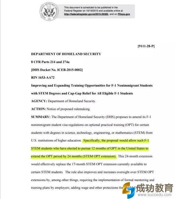 日报记者/张小满发自NYC, NY持F1签证的STEM学生毕业后OPT的总时长有望达到三年!《北美留学生日报》很负责地告诉你,这条刷爆朋友圈的重磅消息并非谣传。 美国时间本周五10月16号,美国政府的联邦公报官网上刊出了美国国土安全部(DHS,The Department of Homeland Security )长达107页的、关于STEM学生的OPT延长提案(尚未正式公开发布的PDF版本)。提案清晰表明国土安全部 计划将STEM学生的OPT延长期定为24个月而不再是之前的17个月,相关申请要求基本不变,同时加大监管力度,并继续实行Cap-Gap Relief,保证H1B中签之后F1签证自动延长以维持学生合法身份。 更美好的是,原本正处于17个月延长期或尚未开始extension的STEM学生都可以按新方案将自己的extension最长化至24个月,这好比是OPT的price match优惠政策, 只要你的OPT extension尚未结束,都能要到属于你的多出来的7个月福利。当然,这份诱人的新提案对于已经结束OPT extention的学生或是任何非STEM学科的学生将不会产生任何影响。