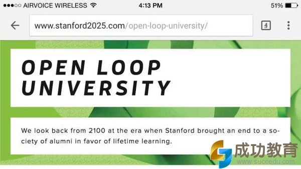 为了更好地帮助斯坦福未来的学生和校友们理解、支持和接受很多重大的改变,斯坦福大学特别制作了一个网站来宣传斯坦福将成为一个所谓的“开环大学” (Open LoopUniversity)。
