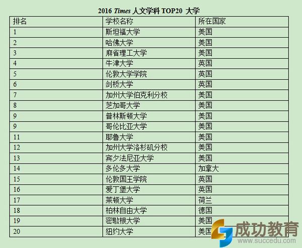 在Times发布的2016全球人文专业大学排行榜的前100名中,英国大学占据了1/5,与去年持平。牛津大学、伦敦大学学院、剑桥大学、伦敦国王学院、爱丁堡大学5所院校跻身世界前20。前20的院校中,虽然美国大学占据绝大多数,但其他国家院校跻身世界名校的势头也不可小觑。