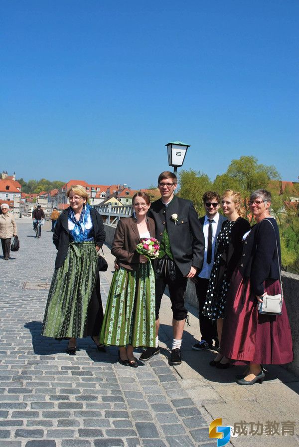 石桥上遇到的身着巴伐利亚服装的新婚夫妇