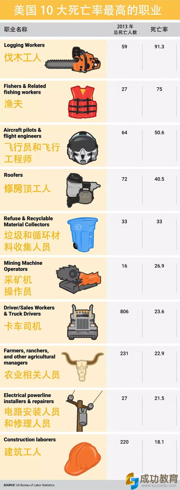 @美国留学中心虽然美国全国的职业死亡率正在下降,仍然有一些工作非常的危险。根据美国劳工部最新的数据,2013年,美国全国供报告了4585起工作导致的严重伤亡事件