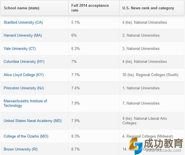 2014年秋季美国录取率最低的10所院校中,斯坦福大学的录取率最低,仅为5.1%;其次是哈佛大学,录取率为6%;耶鲁大学2014年秋季的录取率也只有6.3%。
