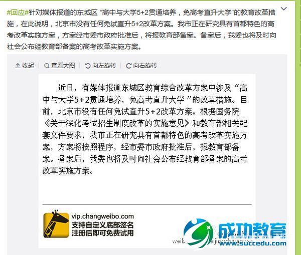 北京市教委微博官方账号回应截图。 近日,有媒体报道东城区教育综合改革方案中涉及“高中学校与大学5+2贯通培养,免高考直升大学的改革措施。”对此,北京市教委回