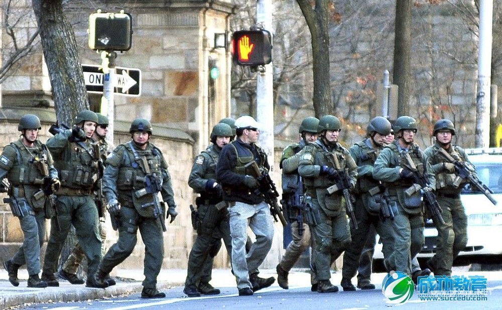 图:二十六日耶鲁大学传有枪手出现,警方封锁学校进行排查 美联社