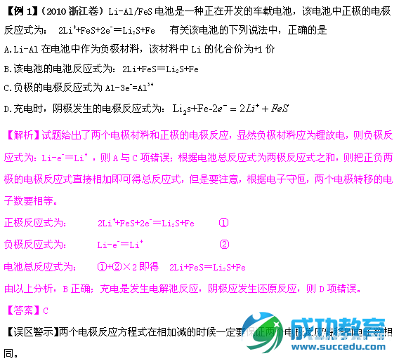 如果已知电池反应的两个电极反应式,则它们相加就是电池总反应式。反之,如果已知电池反应的总反应式,可先写出较易书写的电极反应式,然后在电子守恒的基础上,总反应式减去较易写出的电极反应式,即得到较难写出的电极反应式;这就是所谓的“加减法”。