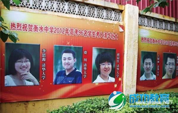 河北衡水中学门前英才路两旁的围墙上贴满了被北大、清华等名校录取的学生照片,长达百米,蔚为壮观。