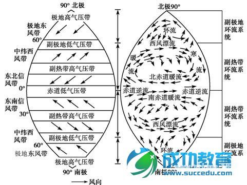 ①促进高低纬度间的输送和交换,调节全球平衡。
