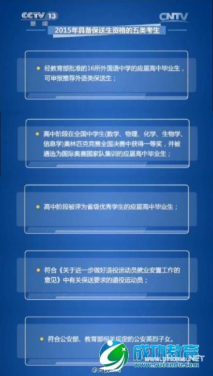 据中央电视台新闻中心官方微博“央视新闻”消息,教育部近日明确5类考生今年具有高考保送资格,分别为:教育部批准的16所外国语中学的应届高中毕业生;获奥赛一等奖、并被选为