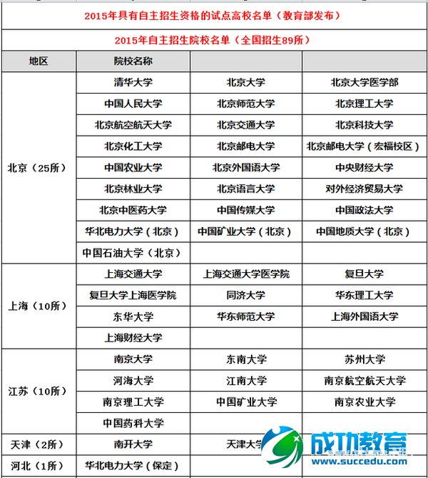 从教育部阳光高考信息平台获悉,2015年共有102所试点高校具有自主招生资格。其中面向全国开展自主招生的高校有89所(含分校),面向本省开展自主招生的高校有13所。