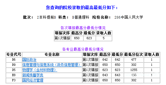 人大在此生源地招生本批次计划招生5人,1:1.05提档,最后提档6人。