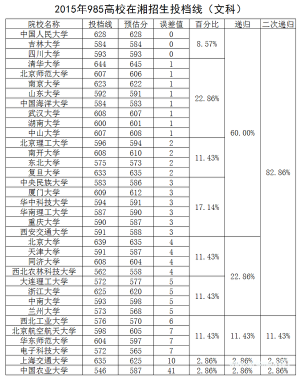 2015年985高校在湘招生投档线