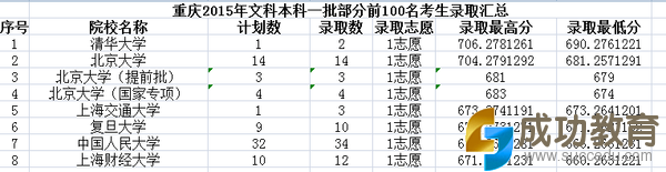 重庆2015年文科本科一批部分前100名考生录取汇总