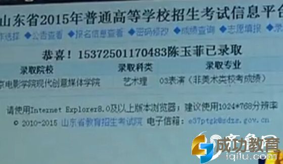 在山东省2015普通高等学校招生考试信息平台上显示,小陈已经在8月2日11点41分被北京电影学院现代创意传媒学院03表演专业录取了。